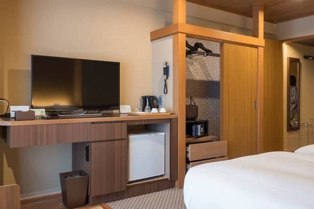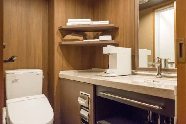 洗面台には浄水器も置かれ、持参した化粧品なども広げられる広さです。バスタブ付のバスルームはタタミルームCのみで、他の客室はすべてシャワーブースですが、大浴場があるので特に不便さはありません。