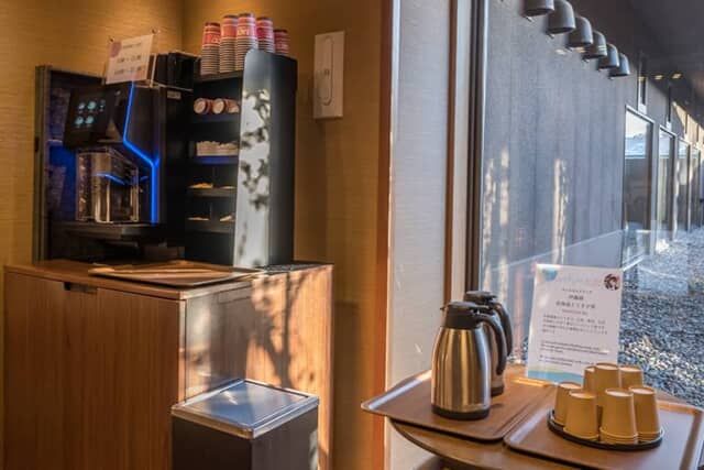 レストラン前のラウンジにはドリンクコーナーが置かれ、コーヒーやお茶を用意。チェックイン時のウェルカムドリンクや食後のコーヒーなどを自由に楽しめます。