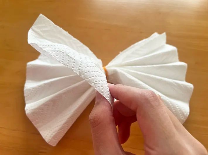お花紙で花飾りを作る時の要領で、蛇腹に折ったキッチンペーパーを1枚ずつ、上に向かって立ち上げていきます。