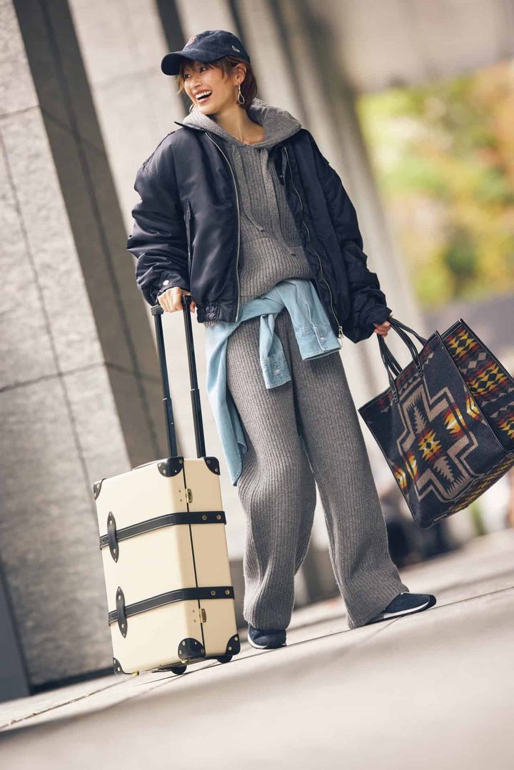 ジャケット¥39,600(プランクプロジェクト/プランクプロジェクト 青山店)ニットパーカ¥55,000パンツ¥49,500(ともにサードマガジン)腰に巻いたデニムシャツ¥19,800(カデュネ)トランク¥330,000(アドーア)バッグ¥84,700(ア ヴァケーション/ノーベルバ)スニーカー¥16,280(ニューバランス/ニューバランスジャパンお客様相談室)キャップ¥5,500(ニューエラ)ピアス¥30,800(ブランイリス/ブランイリス トーキョー)リング¥38,500(リューク)