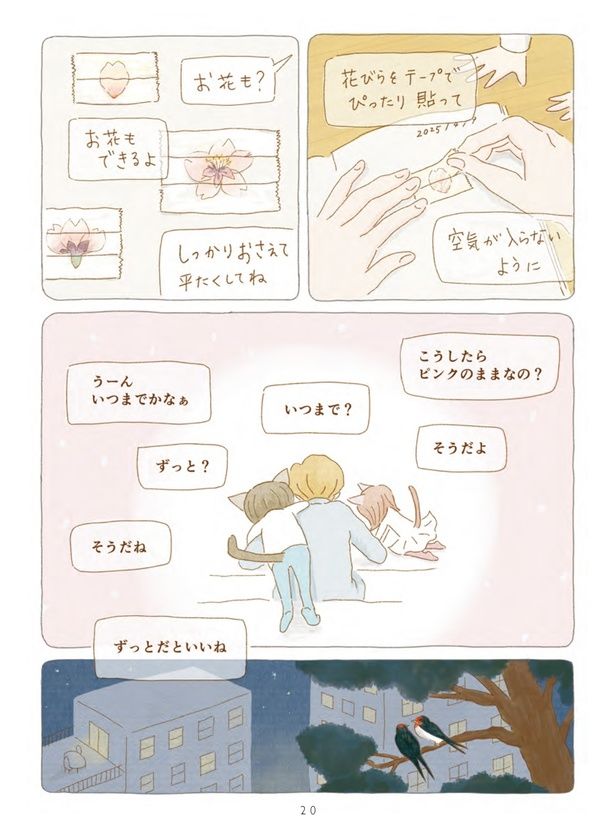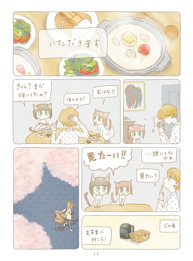 お花見、梅仕事、お盆、花火、紅葉、冬支度のお裁縫… さくらんぼ、お祭りの綿あめ、焼き芋、エッグノック、手作りパン… 季節の移り変わりを楽しみ、おいしいものに囲まれながら、愛あふれるしあわせな日々。 絵本のような癒やしのコミック『夜が明けるとき猫がそばにいれば』をお届けします。