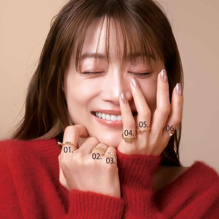 01.リボンをスタイリッシュに昇華。リング[K10YG×DIA]¥99,000(カラットアー/イセタンサローネ東京)02.上品なレースを思わせるデザイン。リング[K18YG×DIA]¥209,000(ヴァンドーム青山/ヴァンドーム青山本店)03.地金のテクスチャーで光の反射を楽しめるリング。リング[K10YG]¥40,700[1/20〜価格改定](スタージュエリー)04.エレガントな着こなしにモードなエッセンスが加わる格子柄デザイン。リング[K18YG]¥169,400(KEIR./ロードス)05.8月の誕生石であるペリドットのピュアなインパクトが魅力。リング[K18YG×ペリドット]¥160,600(マリハ)06.大小のパールをアシンメトリーにデザインしたモダンな一本。リング[K18YG×アコヤパール×DIA]¥74,800(ete bijoux)