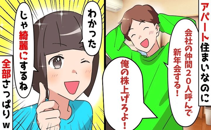 そんなある日、夫が唐突に「新年会は家でやるからさ!俺の株上げてくれよな!」と言うのです。一瞬、耳を疑いました。うちは狭いアパートで……。何より、私の予定も気持ちも無視した発言に唖然としました。