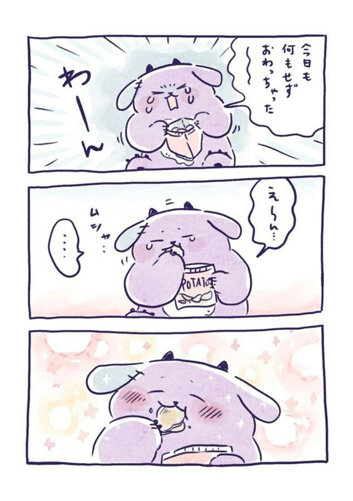 「今日も何もせずおわっちゃった~」から2コマ目、3コマ目…とどんどん気持ちが引き込まれました。日常のふとした悲しみや後悔は、お菓子など美味しい食べ物で吹き飛ばしてしまうことも。
