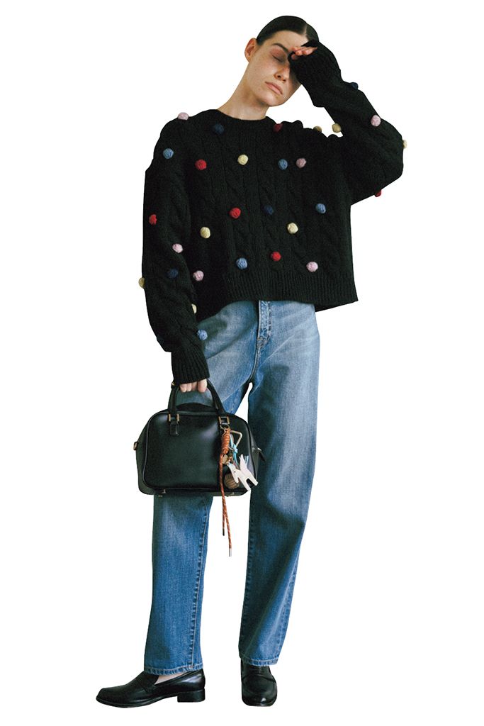 背面にまであしらったポンポンでどこから見てもごきげんな雰囲気。色とりどりの糸を丸めてドット風に仕上げた、レトロポップな黒ニットは色落ちデニムと好相性。細身のテーパードラインがキレイな印象へ引き寄せるため、ほどよいなつかしさにとどまる。