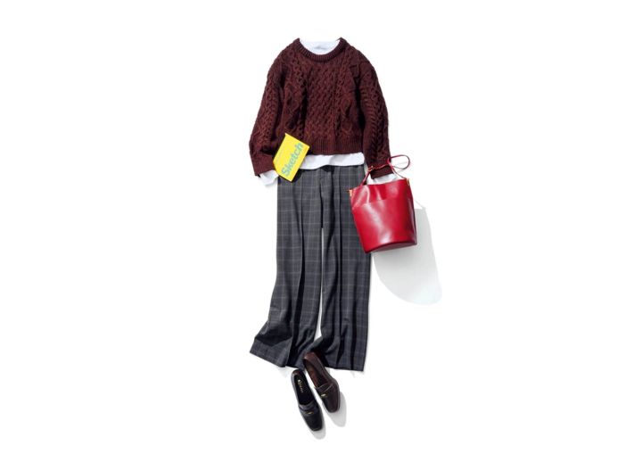 パンツや小物は昨日と同じでも、トップスをケーブルニットにするだけで知的なトラッドスタイルへ印象ガラリ。中に白Tを挟むと、クリーンさと奥行きが、マシマシに。