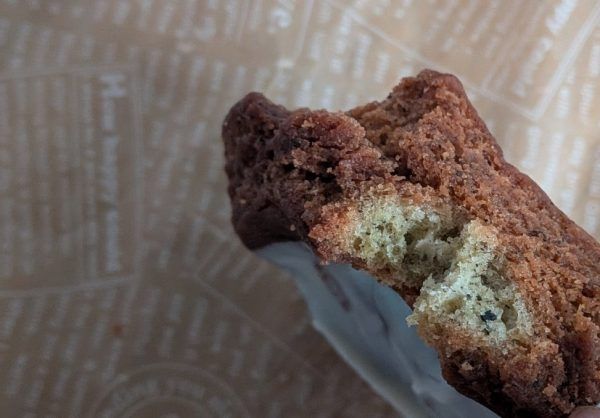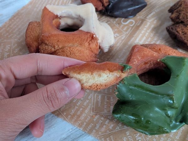 アールグレイは、生地に茶葉が練り込まれていますよ。 チョコなしタイプは電子レンジやトースターででき立て風に食べるのもお勧めだそうです。そして一番お勧めの食べ方で、凍らせても食べてみました。常温では昔お母さんに作ってもらったドーナツのように揚げ油の風味がしっかりありましたが、冷凍するとそれがやわらいで食べやすくなり、ザクっとした食感に。冷凍でも、オイリーで、ドーナツらしさはそのままですよ。