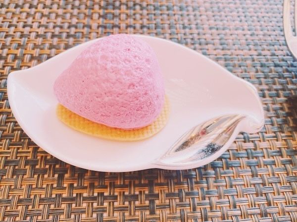 天界を彩るいちごたち シトラス香るレモンクリームと、いちごの甘味が調和したムースで、口の中に爽やかな風味が広がります。天使が天界で愛でるいちごをイメージしているそう。いちごの形がとても可愛らしく、食感も軽やか。中のレモンクリームとムースの相性が良く、思わず「好き」と感じた一品でした。