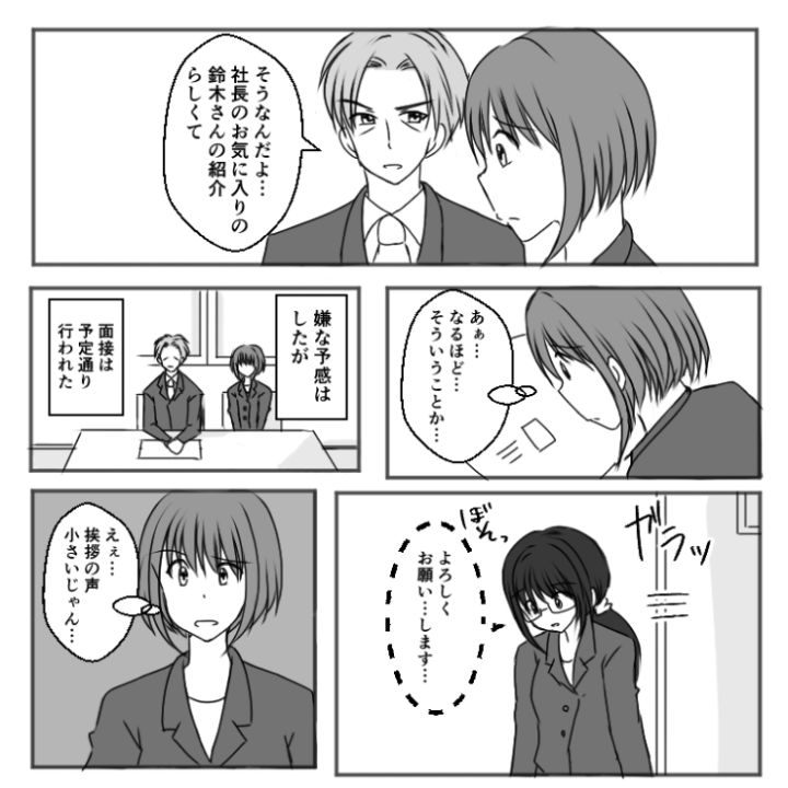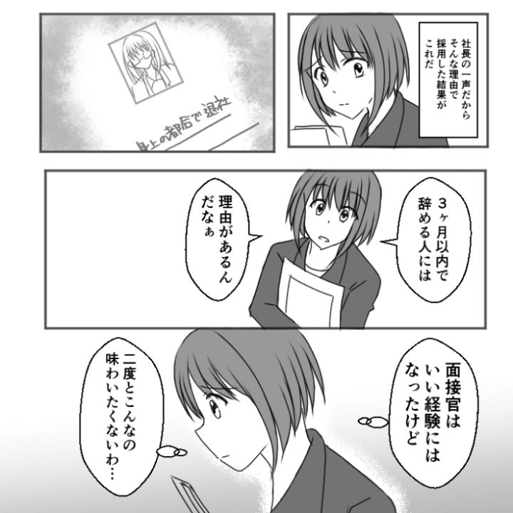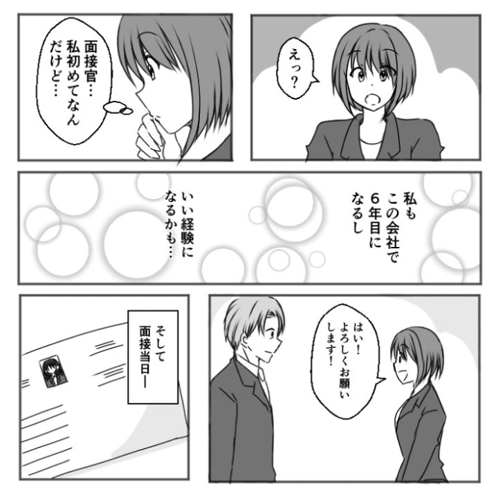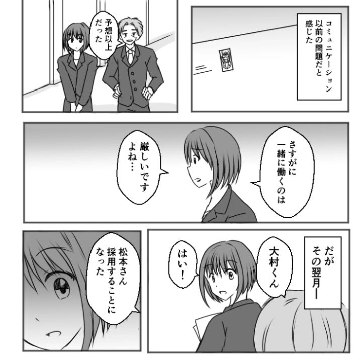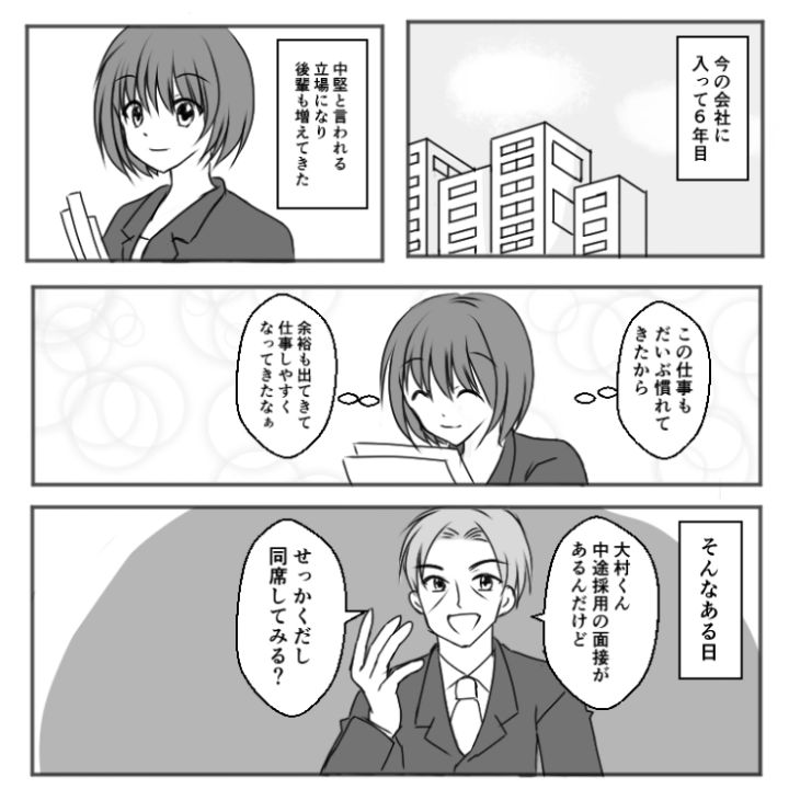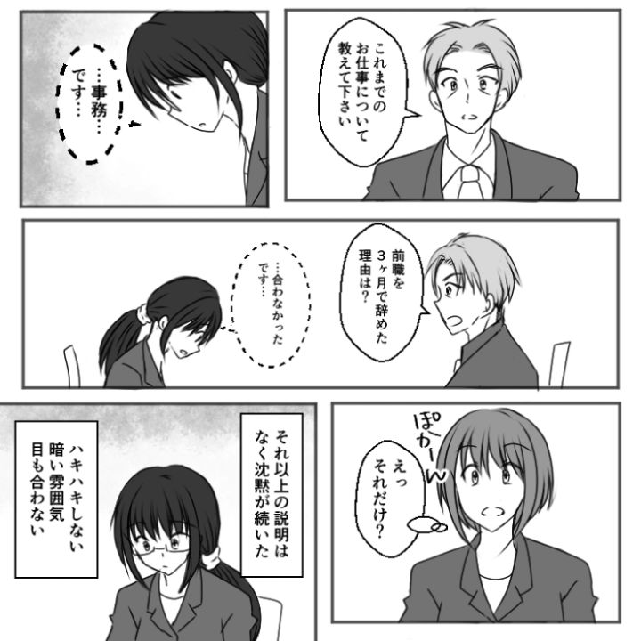 主人公は会社に入って初めて中途社員の面接に同席することに。しかし、とんでもない候補者がやってきて・・・。