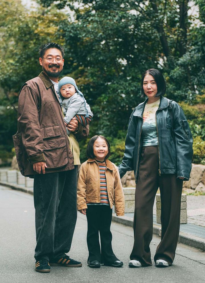 ボーダーをシェアしたきょうだいコーデが可愛い! チョーカーやビーニーなどのひと癖小物は、キッズたちのテンションを上げるスパイスに。ママパパはブラウンをベースに挿し色を効かせた、こなれた夫婦リンクコーデを満喫♪