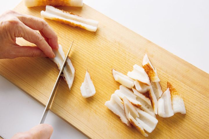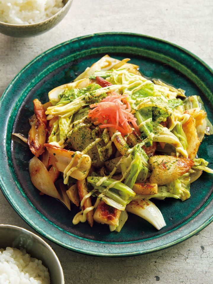 (2)フライパンにサラダ油を中火で熱し、ちくわを入れて1~2分炒める。玉ねぎを加えてさっと炒め、キャベツ、和風だしの素を加えてふたをし、2分ほど蒸し焼きにする。ふたを取り、ソースを加えて炒め、全体になじませる。器に盛り、マヨネーズをかけて青のりをふり、紅しょうがをのせる。