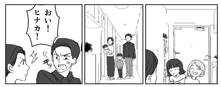 私はヒナカ。夫タカノリと小2のハルマ、5か月のヨウタの4人暮らしです。義妹一家と義母がわが家に泊まるため、来訪しました。その後、夫がハルマの宝物を甥っ子たちに与えたことで、私は激怒。思わず取り上げると、夫は「遊んでたのに何するんだ」と怒鳴りました。私たち夫婦が言い争っていると、ハルマが壊れたロボットを手に大粒の涙を流しました。義妹夫婦が謝罪してくれましたが、夫はハルマがさらに傷つくような言葉を放ちます。そして私の怒りは頂点に……。私が夫を睨みつけると同時に、ハルマの悲痛な泣き声が部屋中に響き渡ります。