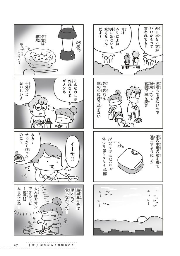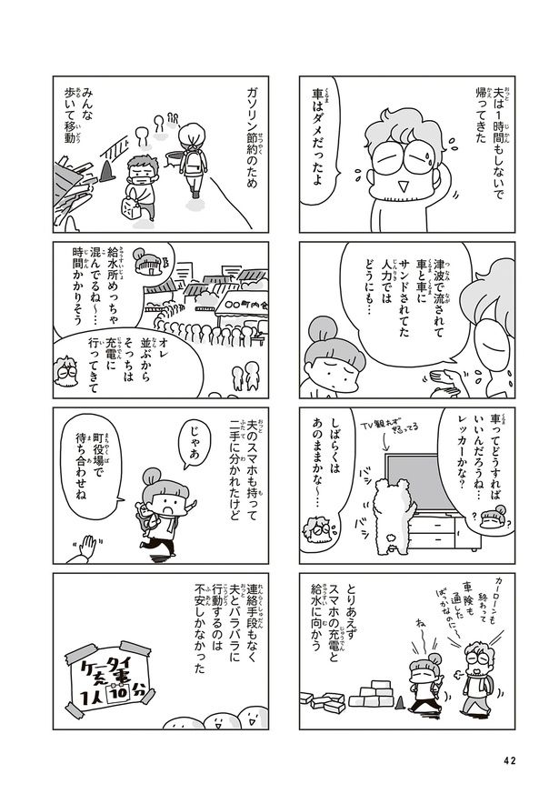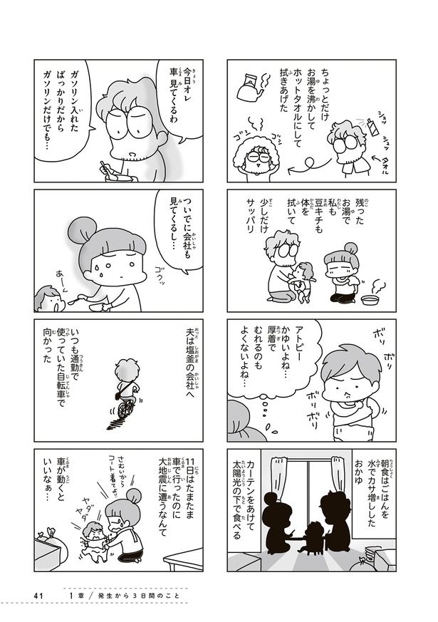 本書は、現在は防災士としても活動する漫画家&イラストレーターである著者が、東日本大震災を経験した当時(2011年3月11日〜4月)の詳細なメモを元にまとめています。