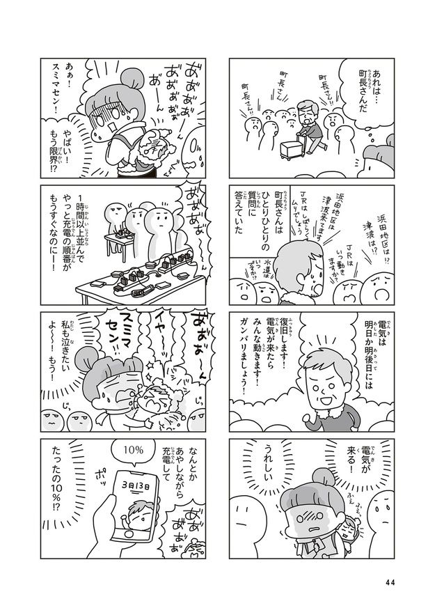 震災から3日目、ぐずる息子を背負って長蛇の列へ。ケータイを充電できたのはたった10分/今日、地震がおきたら④