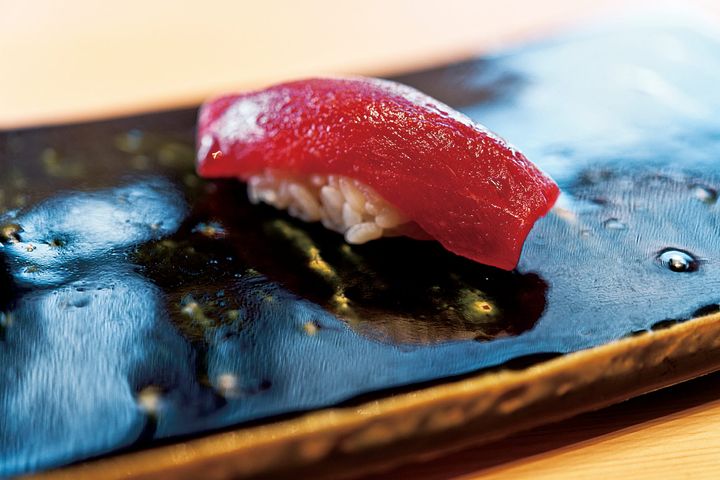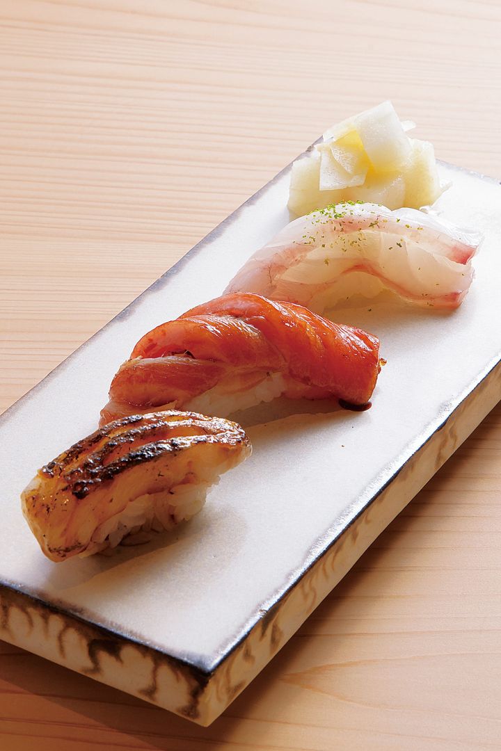 (写真)ディナーのおまかせ¥38,000[サ込み]より。握りは10貫ほど。この日は軽く炙ったノドグロ、エシャロットと生姜が隠し味の大トロ、甘みが際立つクエなど。