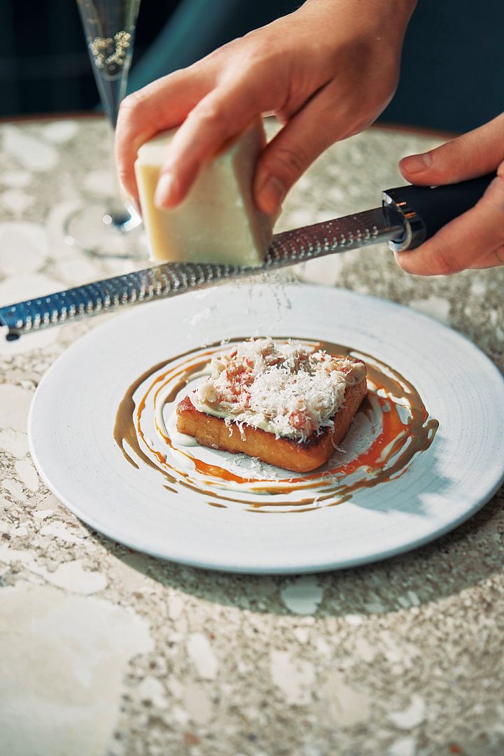 (写真)カニみそ、チーズ、卵黄のソースの濃厚な味わいが後を引く「北海道産ズワイガニを使ったフレンチトースト」。