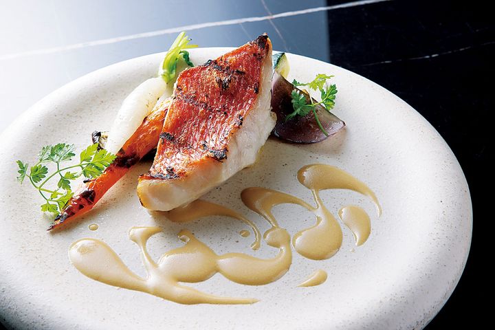 ドライエイジングでうまみを凝縮した金目鯛の炭火焼き。皮目はパリッ、身はふんわり。