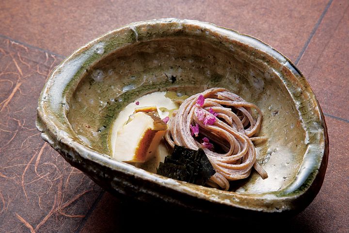 メインの前の箸休めに供される、厨房で手打ちする出雲産そば粉10割の田舎そば。この日は黒鮑の肝のソースとあえて。