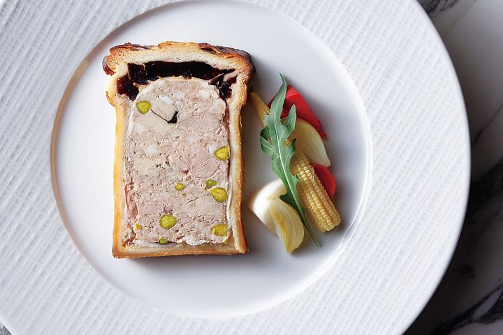 飯塚シェフの味とセントレジスの伝統を融合したレシピで作る「パテ アン クルート」。