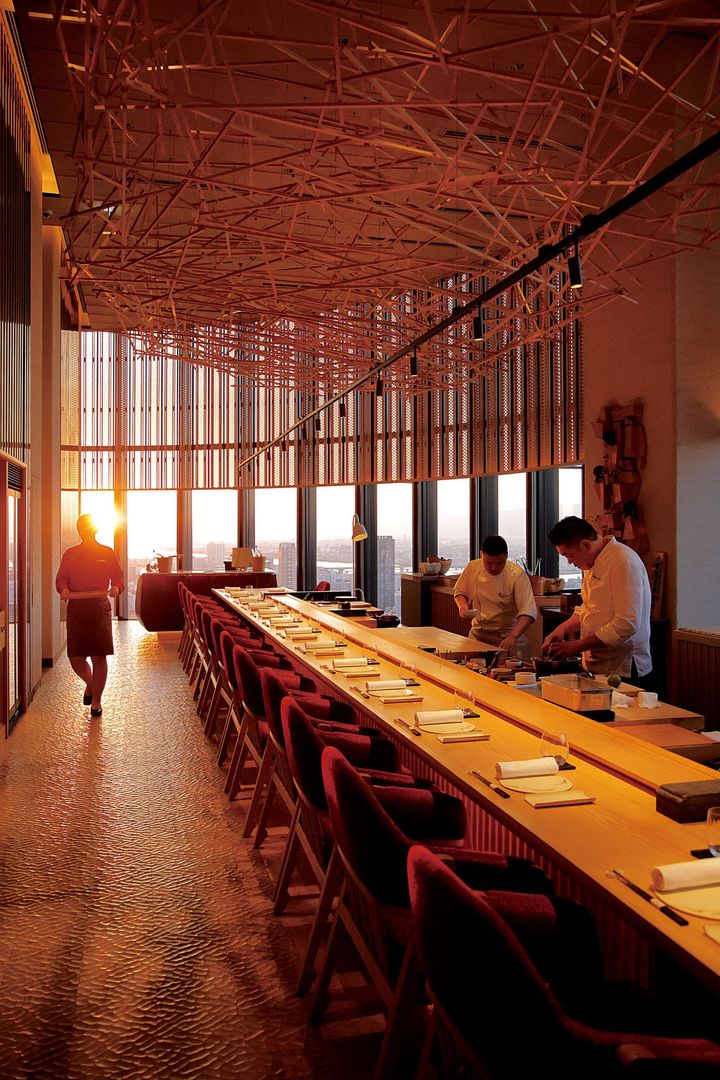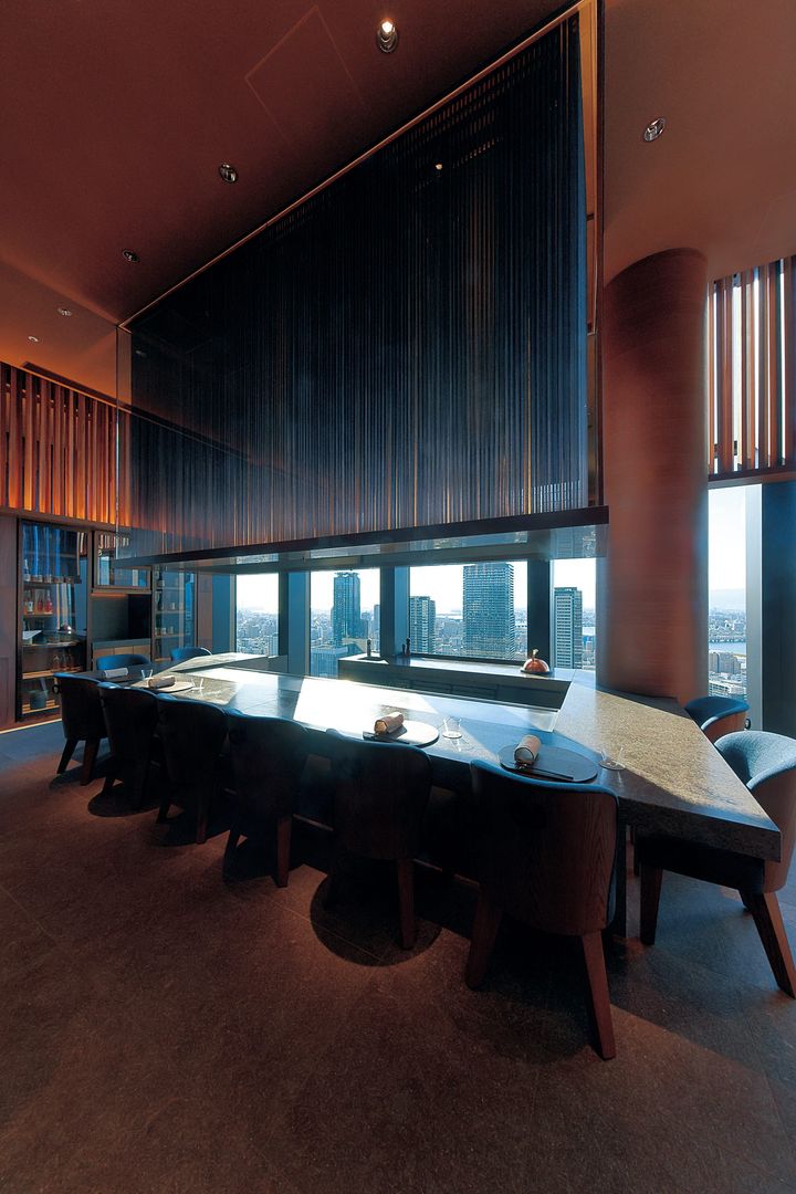 神戸ビーフ、松阪牛、近江牛の日本三大和牛に三重県産活け伊勢エビ、天然赤鮑に本マグロ…。最高級の食材を用いて専属の料理人たちが目の前で作り上げる鉄板焼きと寿司を、素晴らしい眺望を誇るホテル最上階の個室で優雅に味わう――そんなとびきり贅沢なコースがコンラッド大阪の「蔵」にお目見え。肉料理と魚料理を交互に提供したり味わいに緩急をつけるなど、考え抜かれた構成で夢のような時間を演出します。