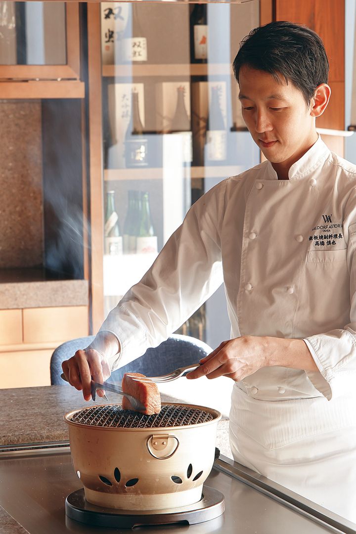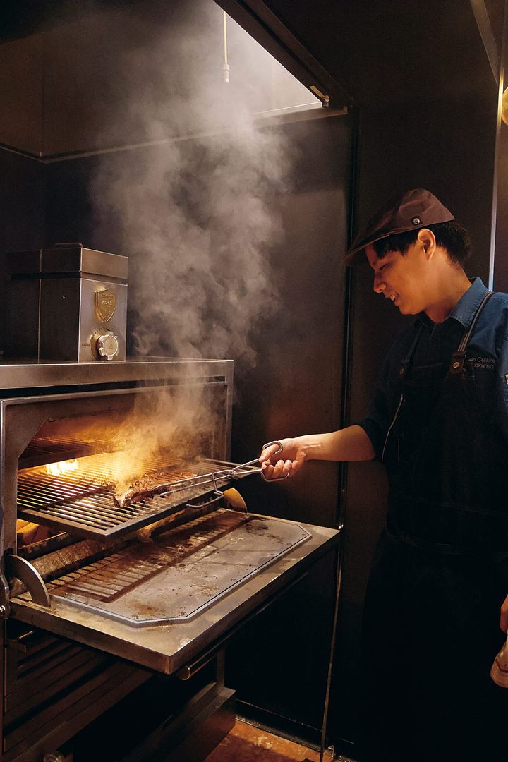 「弾力があるのに柔らかい。そのタイミングを探ります」と炭台で仕上げをする高橋慎也シェフは、自他共に認める“肉オタク”。