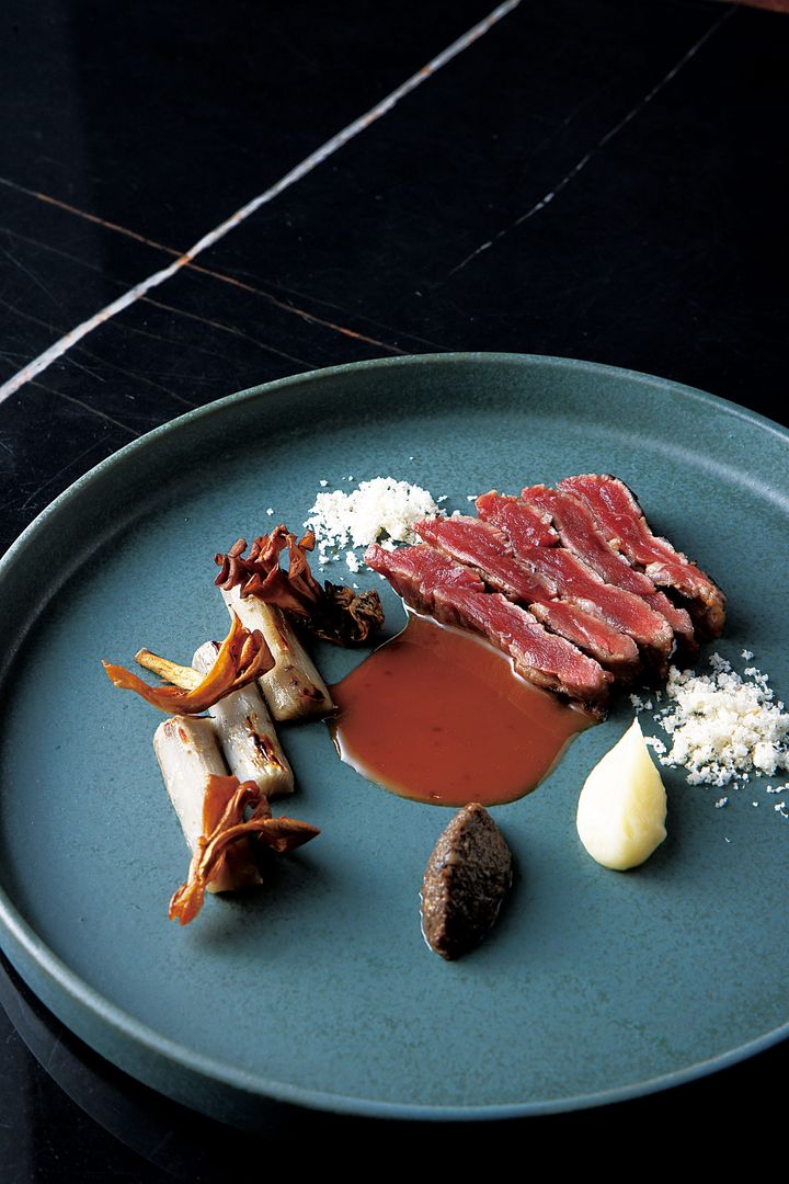 (写真)コースはプリフィックス形式、ディナーは4品¥8,500[サ込み]~。メインの「和牛ランプ肉のグリル」はトリュフが香るペリグーソースと。