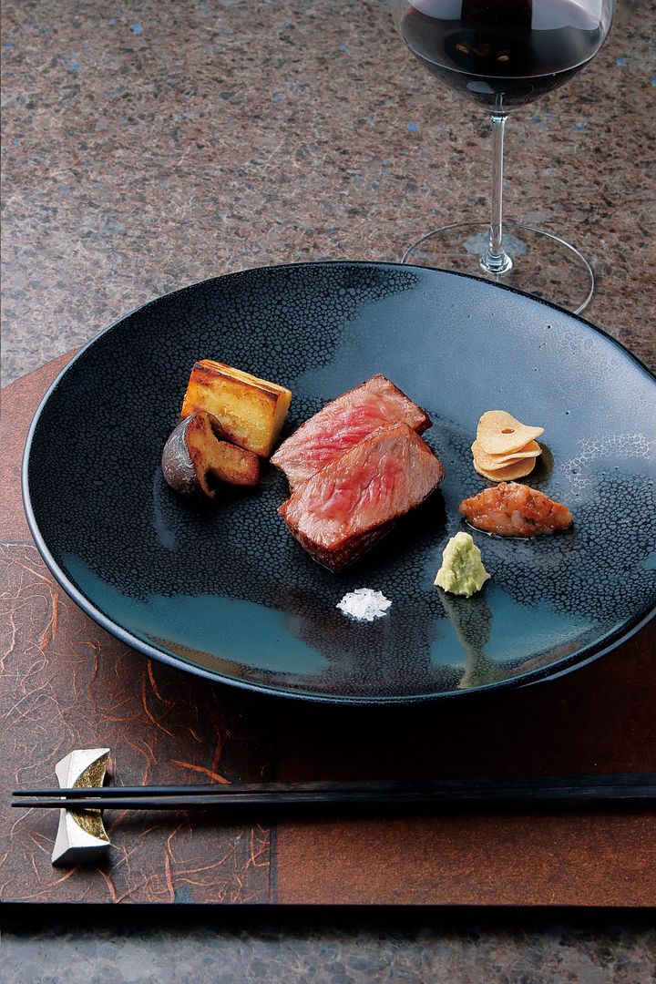 (写真)ディナー「香月」¥62,000[サ込み]より。オリジナルの「月見特選神戸ビーフ」を、鉄板の低温部分でゆっくり加熱した後、炭火で表面を香ばしく、カリッと。赤身のうまみと脂の甘みがあふれます。まずは与那国島の塩でどうぞ。