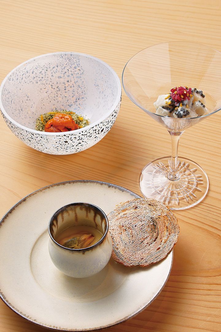 全4皿の前菜「エモーション」は、ヤニックシェフの味を忠実に再現。和風だしを使ったロワイヤルや酒かすをきかせた帆立貝柱のタルタルなど、和と仏の要素が溶け合った新感覚の美味。