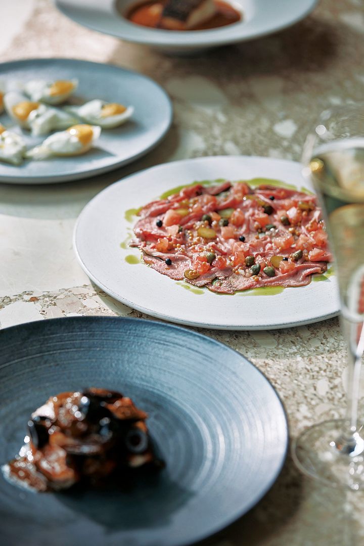 新感覚のラグジュアリーな時間を提案する「パティーナ大阪」。その19階、大阪城を中心に広がるパノラマビューが自慢のダイニングでは、世界が注目する美食の街、スペイン・バスク地方の料理が楽しめます。イベリコ・ベジョータの生ハムやパンコントマテなどのタパスがテーブルに並んだら、まずは乾杯! 続いてはオープンキッチンで炭火オーブンに食材を出し入れしながら、絶妙な加減に焼き上げたグリル料理が登場。「新鮮な山海の幸の持ち味を引き出し、味付けはシンプルなのがバスク流。炭火の香ばしさも肝心です。肉や魚は店内の熟成庫で寝かすことで、味はもちろん食感や香りもワンランク上の仕上がりに」と詫間秀平シェフ。ナチュラルな雰囲気のなか、リラックスして過ごせるのも魅力です。