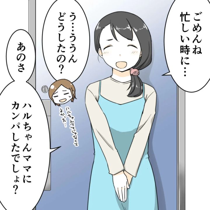 玄関を開けると、「ごめんね。忙しい時に・・」と申し訳なさそうなユウちゃんママ。ユウちゃんママともちゃんと話すのも久しぶりです。ハルちゃんママじゃなくてよかったとホッとしながら「う・・ううん。どうしたの?」と聞くと、「あのさ、ハルちゃんママにカンパしたでしょ?」とユウちゃんママが言いました。え・・どうしてユウちゃんママが知ってるの?
