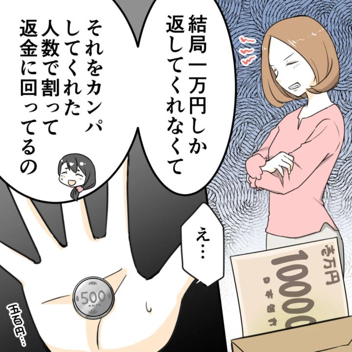 しかし、「結局一万円しか返してくれなくて、それをカンパしてくれた人数で割って返金に回ってるの」とユウちゃんママから手渡されたのは五百円。学校から注意されても全額返金しないなんて・・やっぱりハルちゃんママとは二度と関わりたくない。私はユウちゃんママから返金された五百円玉を見つめながら強く思いました。