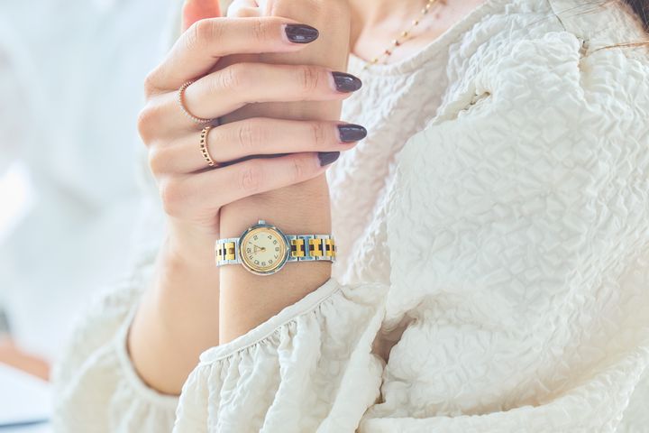 時計は20代の頃にヴィンテージショップで購入した、エルメス クリッパーのコンビ。ヨガ講師ということもあり、普段はあまり時計をつけないのですが、女子会の時には、楽しい時間が過ごせるようにとお守り的に。薬指のリングはハワイで購入したティファニー。夫とおそろいです。