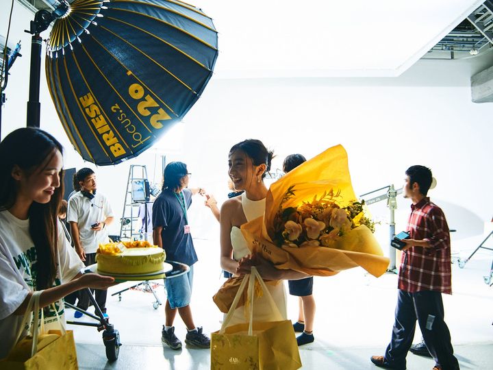 撮影終了後、花束とオリジナルのケーキが贈られて思わず笑顔がこぼれた。 Hearst Owned