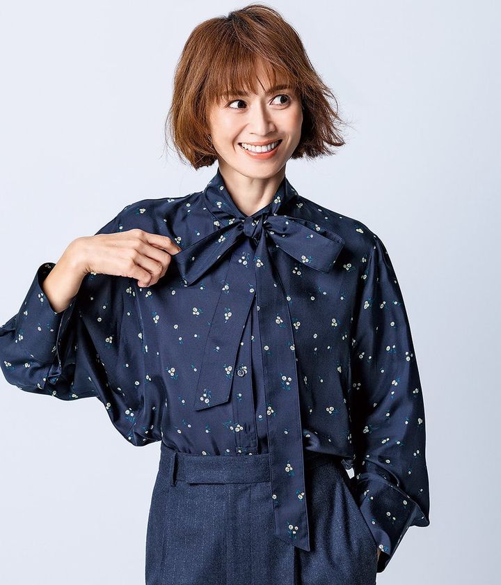顔まわりが華やいで端正な印象になる<細タイブラウス>でモード顔に。奥深い抑揚がコーデに付きます!