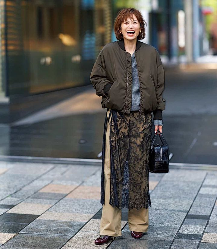合言葉は『ちょい足し』。マニッシュなコーデにあえて重ねたい秋冬の透けはレーススカート一択!この質感をかませ新鮮さは倍増。