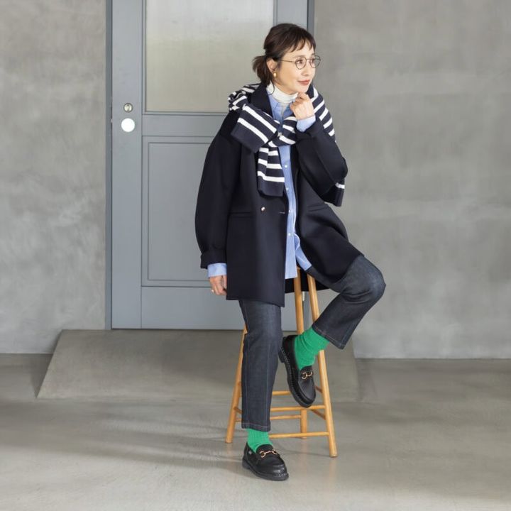 3. 【60代ファッション】靴下がおしゃれのポイントに!効かせ色&スポーティソックスコーデ【冬の足元・首元おしゃれ最前線】