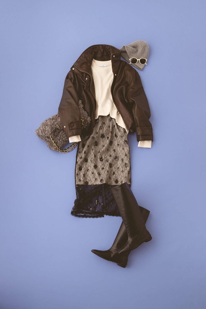 ラフなスウェットに可愛げスカートを合わせた、気負わない大人カジュアル。甘スカート×レザージャケットの甘辛コーデは、ロングブーツで足元を引き締めるのが正解。レース下の肌見せを抑えることでまとまりのある着こなしに仕上がります。