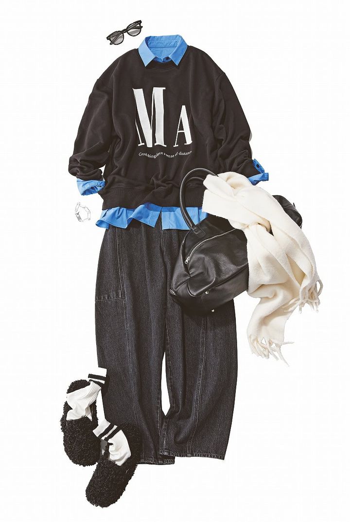 ロゴスウェットのラフさもデニム合わせなら都会的な仕上がりに。アクセントのブルーシャツを少し着崩して仕込むことで、カジュアル感も保ちつつ、ほぼクロが一気に爽やかに。