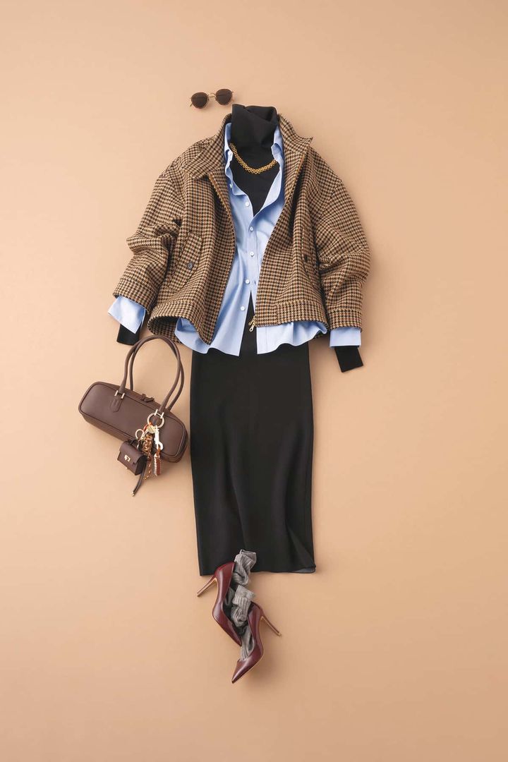 黒タートルに爽やかなブルーシャツをレイアードして上品な印象と抜け感をプラス。チャーミングなチェック柄JK×綺麗めニットスカートで女性らしい雰囲気に。