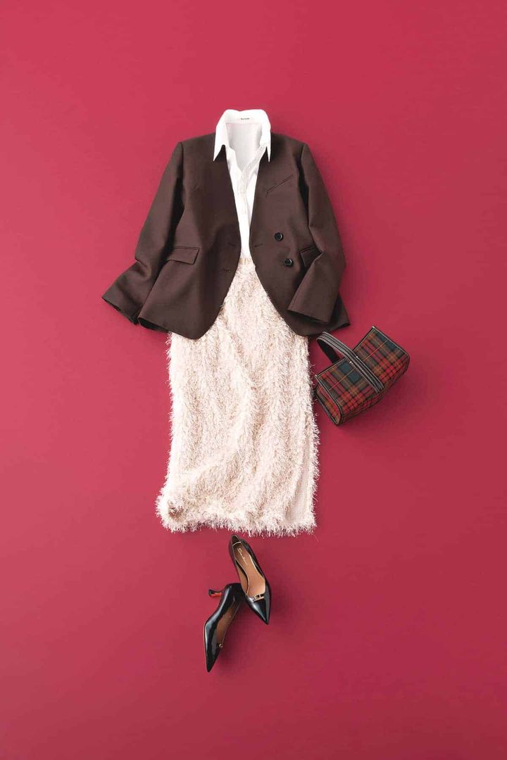 ヘアリーな質感の毛足の長いスカートも清潔感のある白シャツ×落ち着いたカラーのジャケットを合わせてきちんと感を意識。季節感のあるチェック柄ハンドバックで個性をプラス。