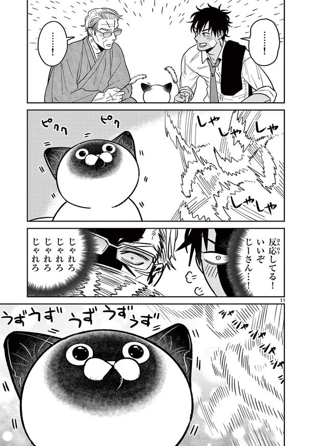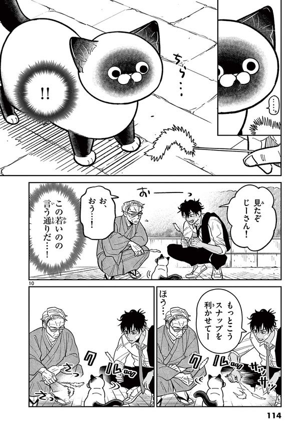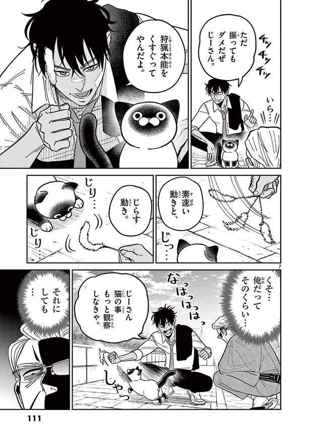 猫じゃらしを試してみるも、全然猫が反応しない。通りすがりの若者から指南を受けると…/オヤジとにゃん吉⑦