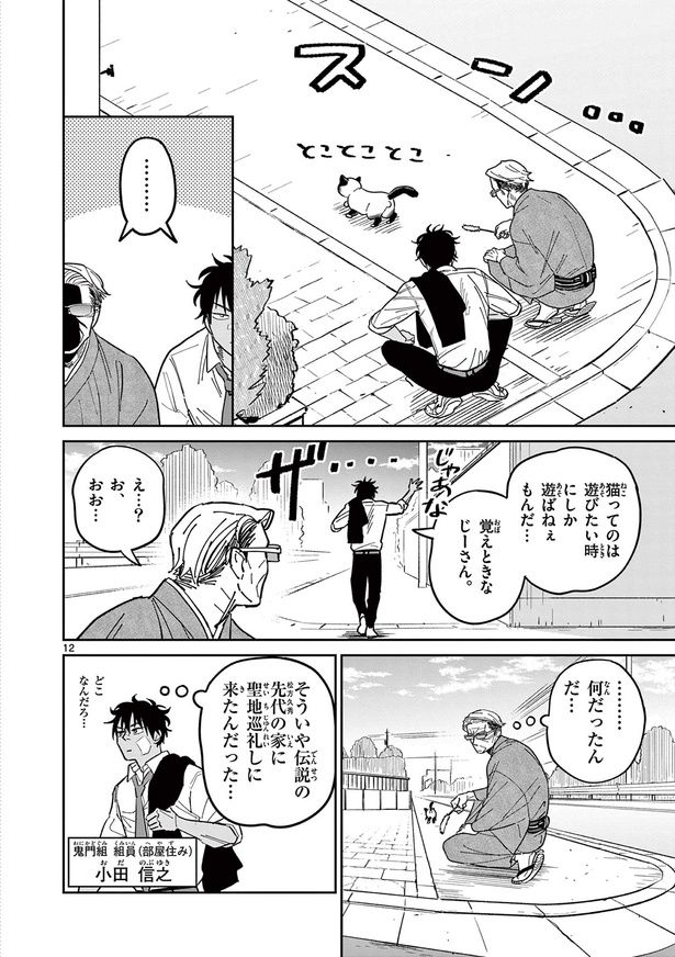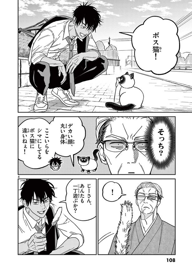 3. 猫じゃらしを試してみるも、全然猫が反応しない。通りすがりの若者から指南を受けると…/オヤジとにゃん吉⑦