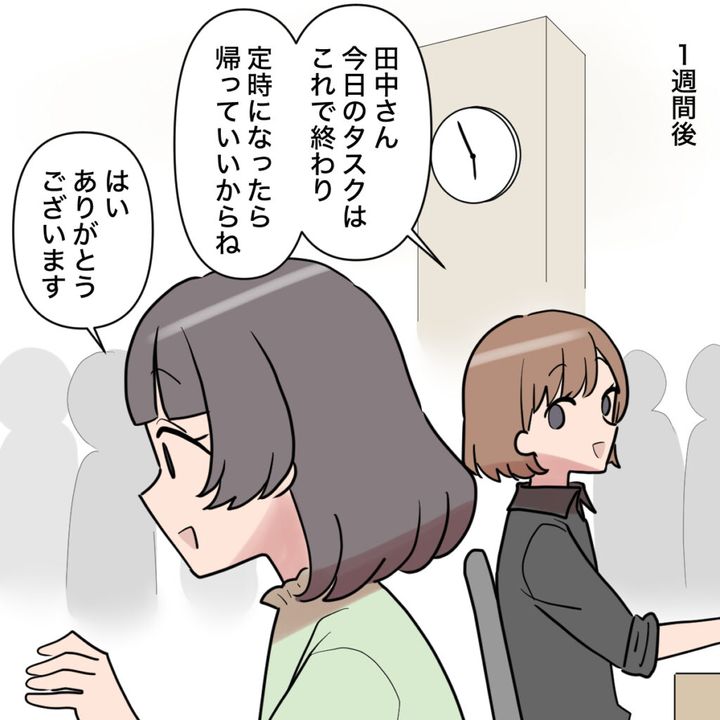 田中さんが入社して1週間、少しずつタスクを与えて私がチェックする毎日を過ごしていました。この日もタスクを業務時間内に終わらせたので「定時になったら帰っていいからね」と声をかけていると、田中さんは「はい、ありがとうございます。」と笑顔で答えました。
