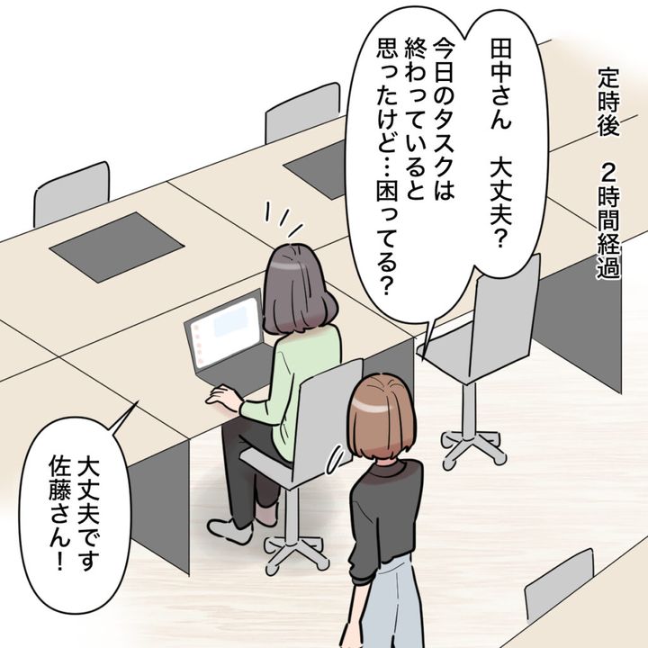 ところが、定時を2時間過ぎても田中さんはまだパソコンに向かっていました。この日のタスクはそれほど難しいものではなかったし、私もしっかり確認済みのはずなのにおかしいな、と不思議に思いながら、困っていることがあるのかと声を掛けました。すると田中さんは間髪入れず「大丈夫です、佐藤さん」と、よほど集中しているのかパソコンから目を離さずに答え、それでも特に問題があるようには見えませんでした。