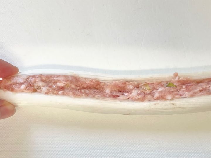 3. 長ねぎを広げ、肉だねを詰めて、元のねぎの形のように棒状に整える。