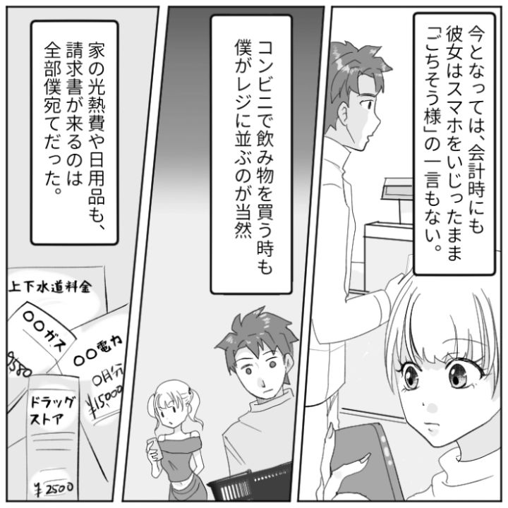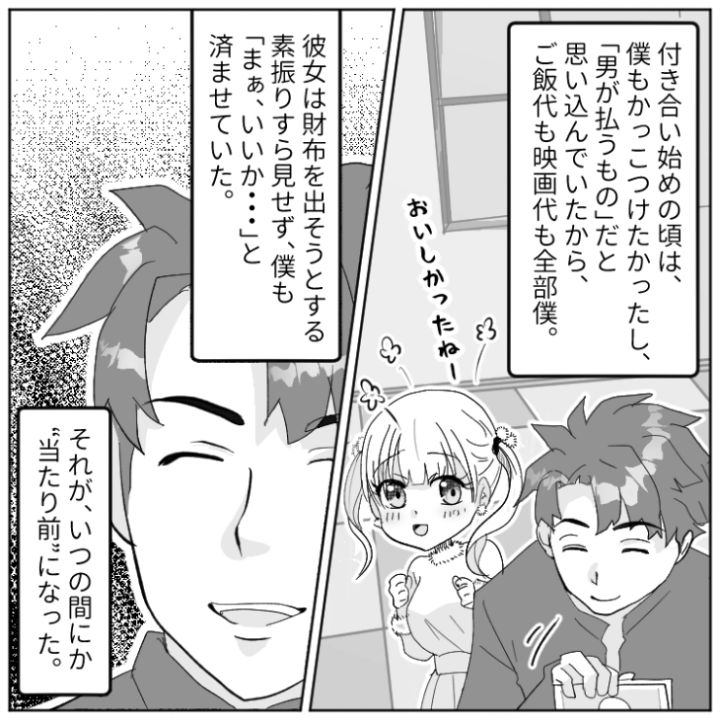 衝撃のエピソードを漫画化!今回は付き合ってからデート代はもちろん同棲してからの生活費を全て主人公に支払わせて感謝の言葉もない彼女のお話をご紹介します。