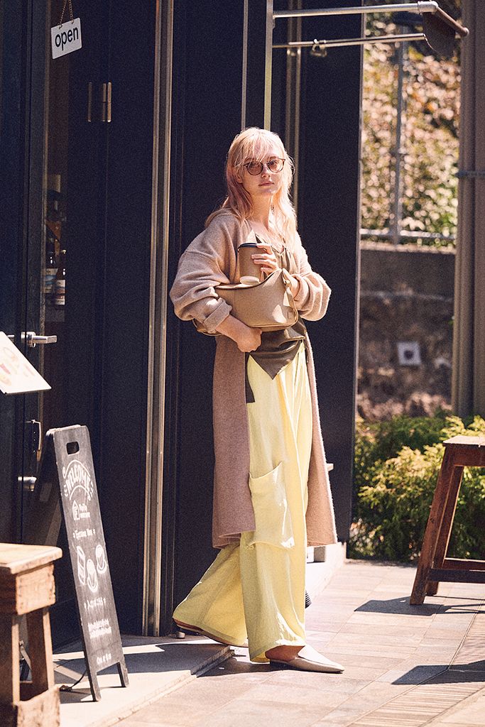 無骨なカーゴパンツを品よく促す、うるおいのあるサテン生地。空気をはらんだ大きなポケットが気だるげにツヤめき、リラックス感をかもしつつも優雅な見た目に着地。なびくようなロングカーディガンをひっかけて、気張らないIラインを構築。