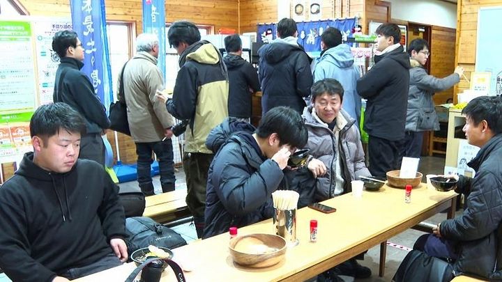 そばを楽しんでいたのは、幌延町の秘境駅・糠南駅で行われたクリスマスパーティーに参加した人たち。