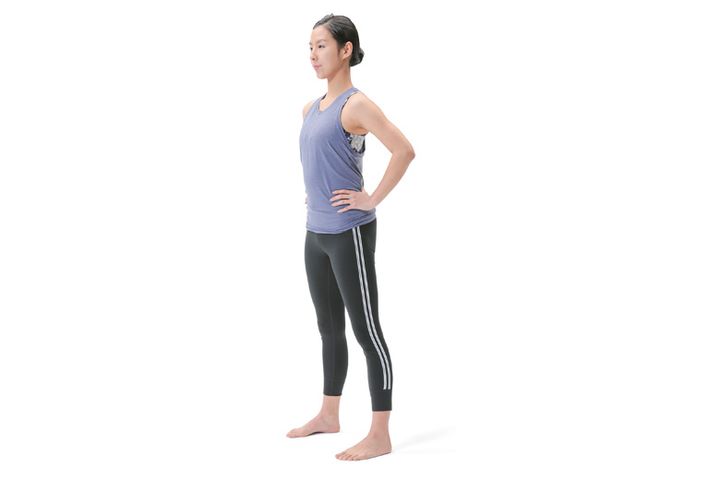 視線を正面に向け、背筋をまっすぐ伸ばして立ち、手は腰にあててバランスをとります。脚は肩幅よりやや広めに開いて、リラックスしましょう。
