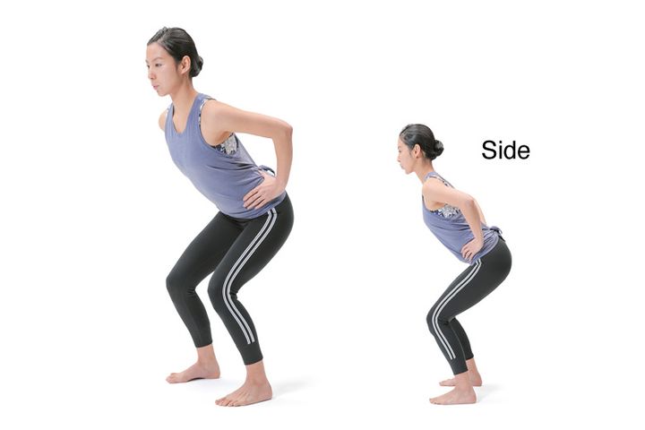 ヒザを曲げ、腰を斜め後ろに引くようにしてスクワットをします。両脚に体重を乗せ、上半身が前のめりにならないように注意するのがポイント。
